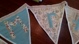 Gloriously vintage yet tastefully arranged Wedding Bunting from our new LGBT range. This is reminiscent of 1930s steamship travel, in classic hues of sepia, beige, vintage cycles, caricature dogs, all uplifted by a glorious spotty duck egg blue. This is made from the finest cotton fabrics, each piece is interlined & edged, whilst the Mr & Mr central pieces features a quilted applique format. It is double headed, with a backing of toned grosgrain ribbon, fronted by a trendy hessian style tape. Approx 2 3/4 metres long, the bunting features side pennants and bunting pieces, each of which is approx 8" wide x 10" long.
